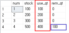 - 'num' 칼럼의 순서대로 값(값의 총합은 1,100)이 입력되어 있습니다. 예제에서 보듯이 1,000(@input_qt) 값이 들어왔을 때 순서대로 'stock' 칼럼에 있는 값만큼 사용(100, 200, 300)하고 남은 나머지(400)를 마저 사용하고 나면 '100'이라는 값이 남게 됩니다.